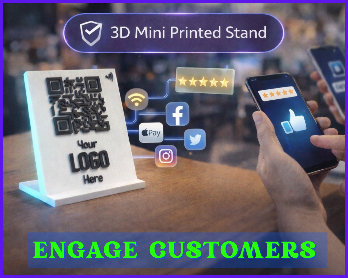 More than a stand it’s your ultimate connection tool. This customizable 3D-printed piece uses QR & NFC to create a single, beautiful touchpoint.