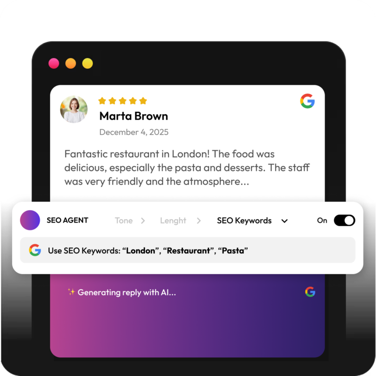 The SEO Agent automatically responds to customer reviews using the right local keywords, services, and locations.