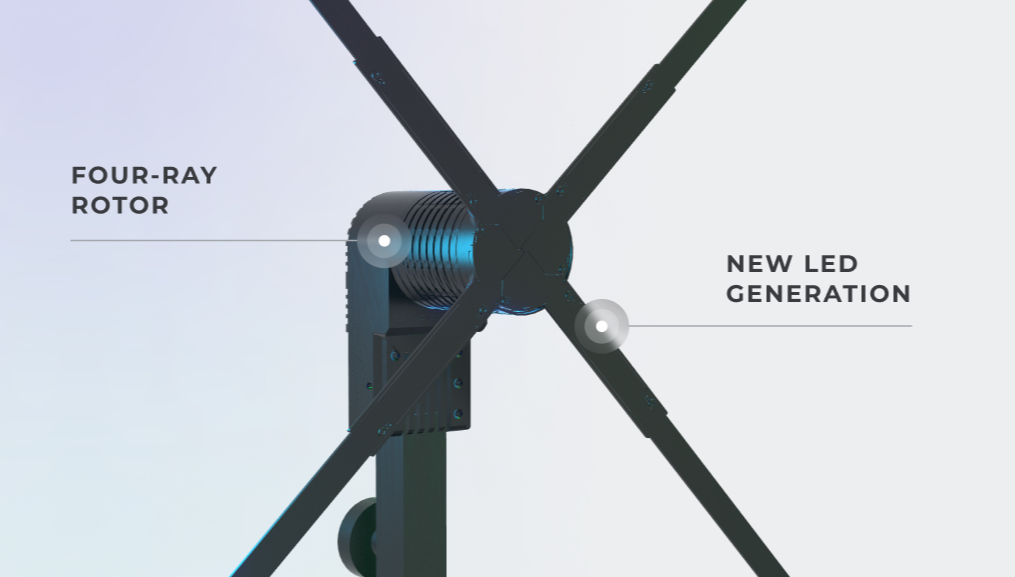 A four-ray rotor display that spins faster than the eye can see, leaving only the 3D content, which appears to be floating in mid air.
